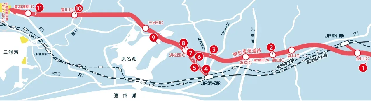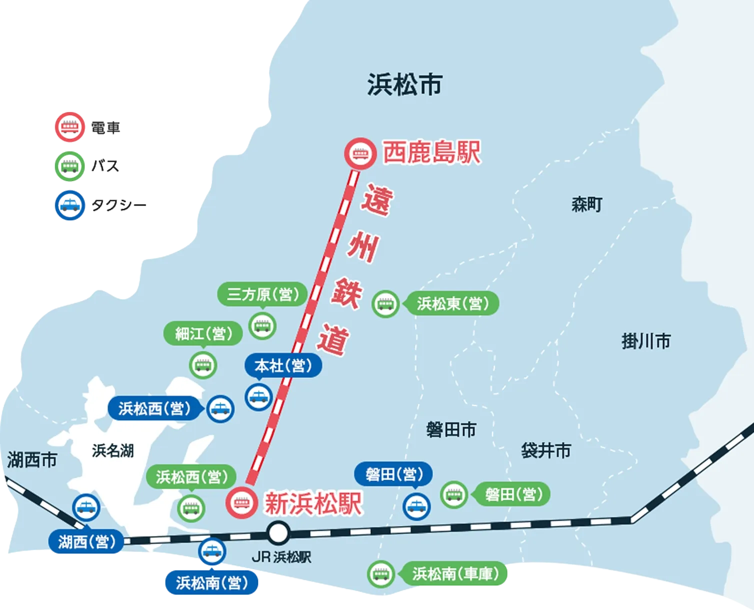 遠鉄グループの交通網は、浜松市を中心に磐田市と湖西市から掛川市までカバー。